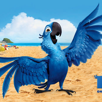 RIO Wearable prop with reference image for desired style of final product and main materials used for fabrication (recycled paper bags handles used for arm & leg bands), layered gift wrap tissue for feather, baseball cap, sunglasses & recycled paper coffee cups for head, eyes & beak) with image of final design for prop worn by elementary student wearing for scale.